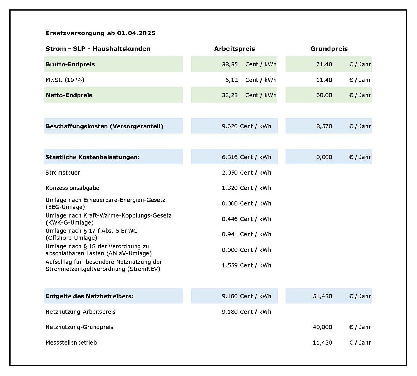 Preis der Ersatzversorgung 01.05.2024 - 31.03.2025